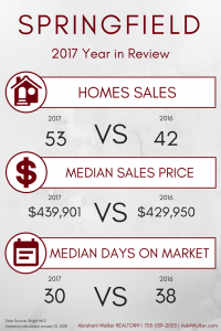 Home sales in Springfield area went down up 42 homes sold back in 2016  compared to 23 homes sold in 2017. However, the median sales price went up to $439,901 in 2017 compared to $429,950 in 2016. The Median days on market went down from 38 days in 2016 to 30 days in 2017.